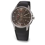 A perfectly crafted, handsome watch from Skagen. Black leather strap and stainless steel case. Charcoal chronograph dial with logo, date window, three subdials, orange accents and silvertone stick indexes. Three hands. Quartz movement. Water resistant to 100 meters. Limited-lifetime warranty.